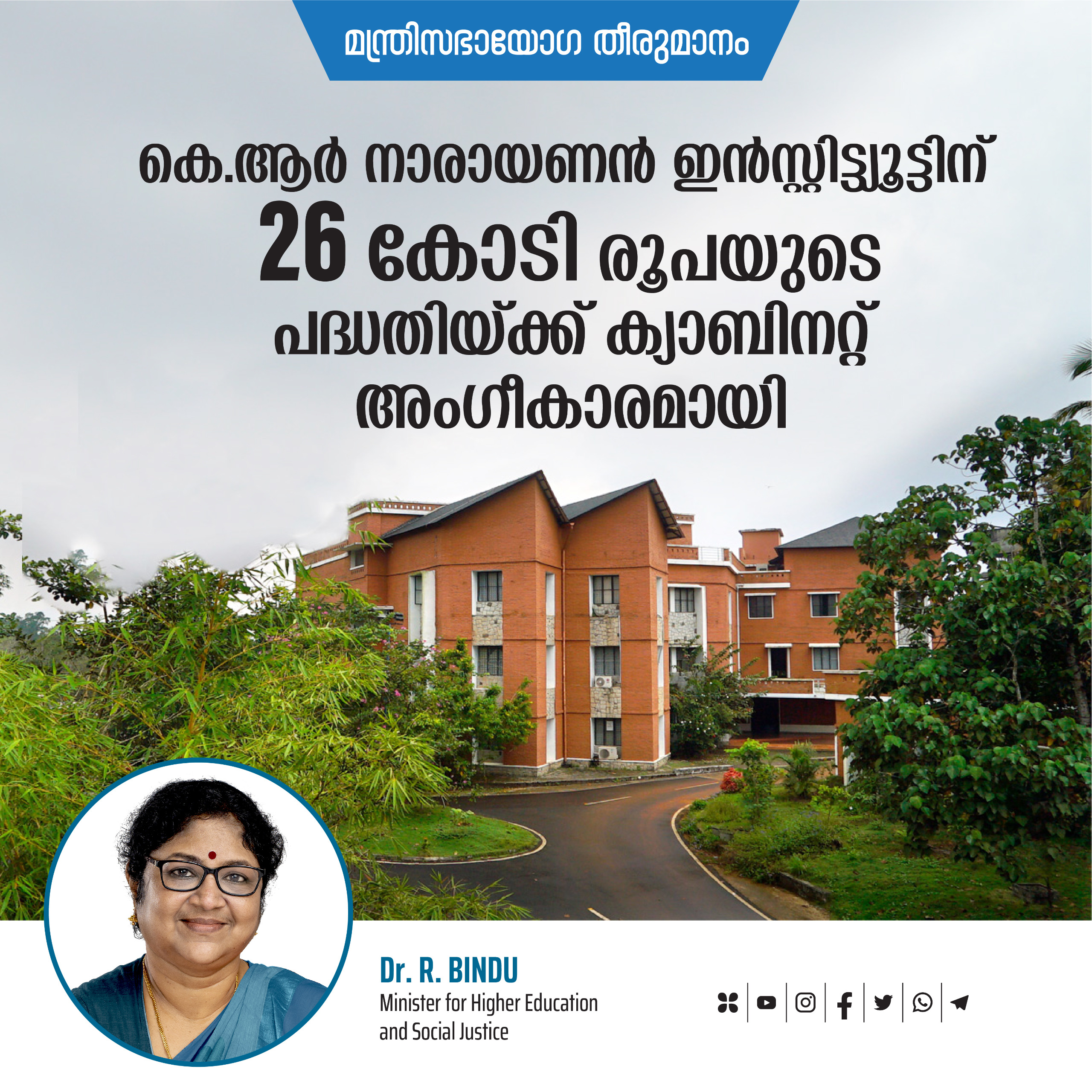 ഇരിങ്ങാലക്കുട : കെ.ആർ. നാരായണൻ ഇൻസ്റ്റിറ്റ്യൂട്ട് ഓഫ് വിഷ്വൽ സയൻസ് & ആർട്സ് ഇൻസ്റ്റിറ്റ്യൂട്ടിന്റെ അടിസ്ഥാന വികസനത്തിന് 26,58,53,104 രൂപയുടെ പ്രൊപോസലിന് ക്യാബിനറ്റ് അംഗീകാരമായതായി മന്ത്രി ഡോ. ആർ. ബിന്ദു അറിയിച്ചു.