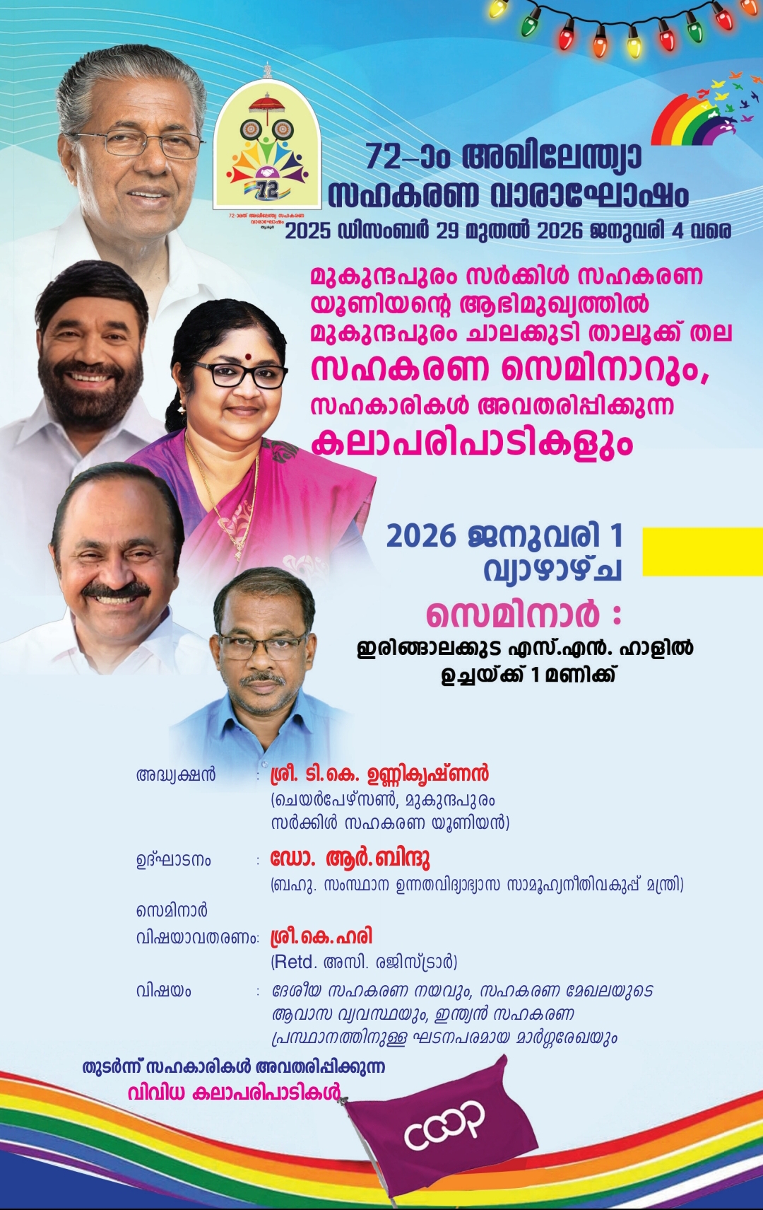 ഇരിങ്ങാലക്കുട : 72-ാം അഖിലേന്ത്യാ സഹകരണ വാരാഘോഷത്തോടനുബന്ധിച്ച് മുകുന്ദപുരം സർക്കിൾ സഹകരണ യൂണിയൻ്റെ ആഭിമുഖ്യത്തിൽ മുകുന്ദപുരം, ചാലക്കുടി താലൂക്ക്തല സഹകരണ സെമിനാറും സഹകാരികൾ അവതരിപ്പിക്കുന്ന കലാപരിപാടികളും ജനുവരി 1ന് ഇരിങ്ങാലക്കുട എസ്.എൻ. ഹാളിൽ നടക്കും.