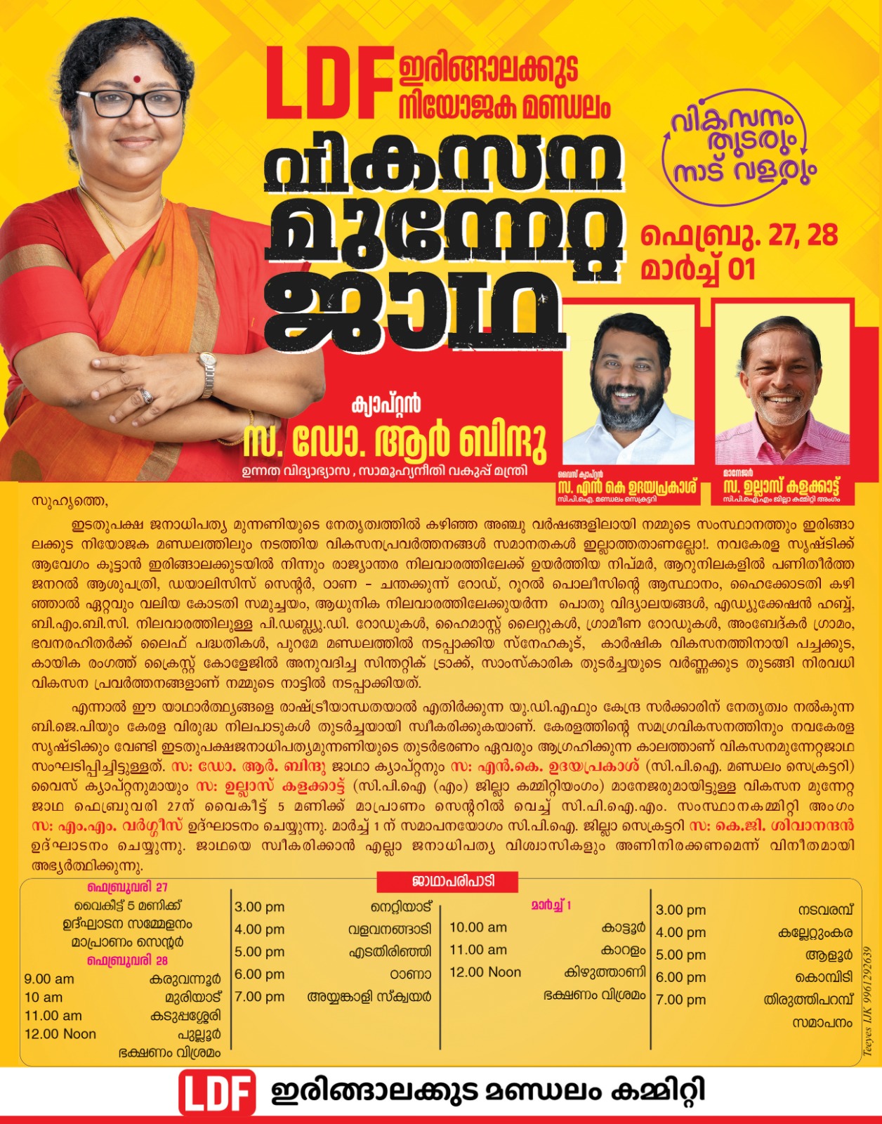 ഇരിങ്ങാലക്കുട തൃശൂർ ന്യൂസ് എൽഡിഎഫ് ഇരിങ്ങാലക്കുട നിയോജകമണ്ഡലം വികസന മുന്നേറ്റ യാത്രയ്ക്ക് 27ന് തുടക്കമാകും irinjalakudatimes.com Feb 26, 2026